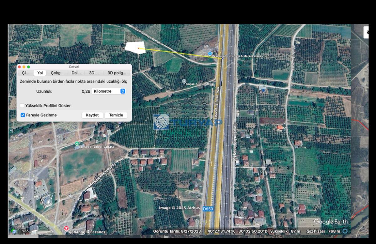 PAMUKOVA MEKECE KALEMLİK MEVKİİNDE SATILIK MÜSTAKİL TAPULU TARLA ; Konum : Sakarya, Pamukova, Mekece Mahallesi, Kalemlik Mevkii, Ada / Parsel : 0 Ada / 392 Parsel, Alan : 2.480 m2 Tapu Durumu: Müstakil Tapulu Tarla Doğayla iç içe, huzurlu bir yaşam veya yatırım fırsatı arayanlar için kaçırılmayacak bir fırsat! Sulama kanalına yakın, Yola cephesi mevcut Verimli toprak yapısına sahip, Antalya yoluna 200 metre mesafede Yerleşim bölgesine 350 metre mesafede, İçerisinde 60 adet yetişkin ayva ağacı bulunmaktadır. Orta ve uzun vadede yüksek yatırım potansiyeline sahip bu arazi hem tarımsal faaliyetler hem de geleceğe dönük yatırım için ideal bir fırsattır. “TEK YETKİLİ TURYAP ADAPAZARI GARANTİDİR” Sorumlu Gayrimenkul Danışmanı Yonca Alkaya Adapazarı Turyap Garanti Tel: 0552 824 49 54