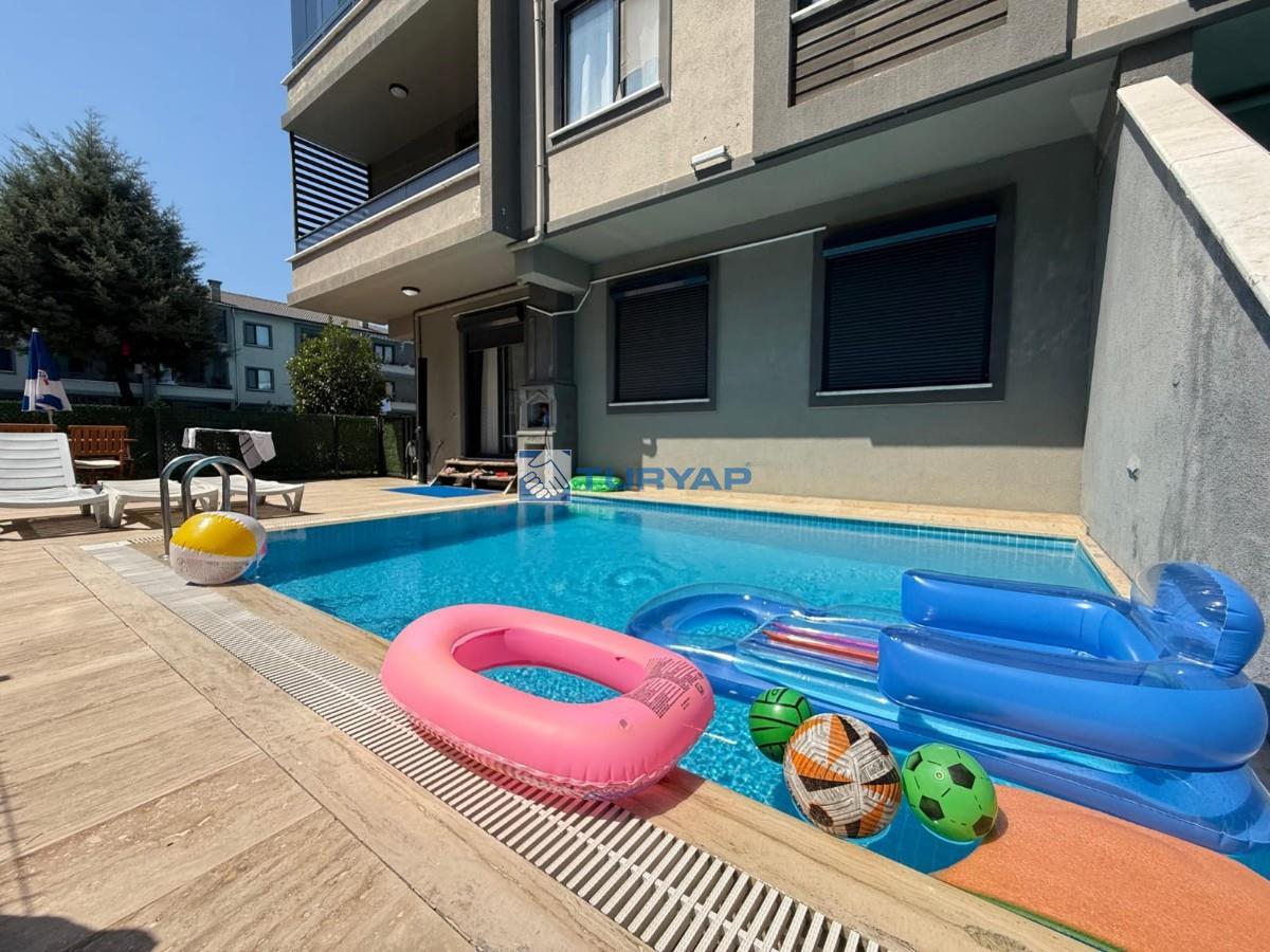 - Daireye özel etrafı çevrili 20 m² si havuz olmak üzere toplam 55 m² açık alan