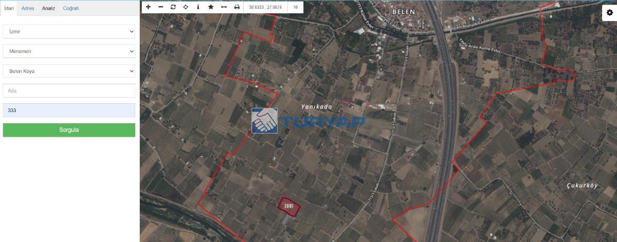 Menemen Belen mevkiin'de 178 metre kare, etrafı tel çit çevrili, yol ve elektrik gibi imkanlara sahip hobi bahçesi.