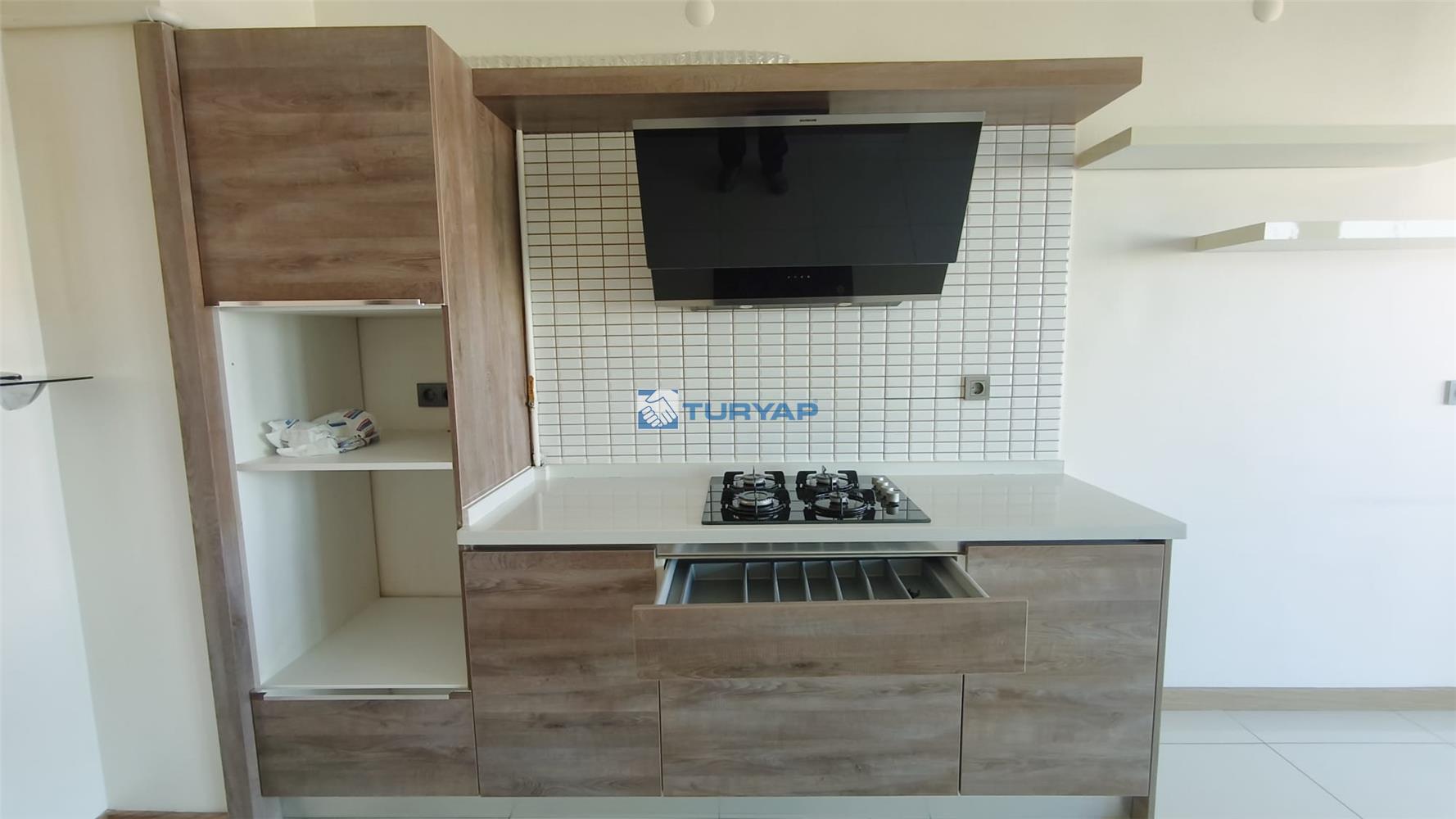 SET ÜZERİ DOĞALGAZLI OCAK VE DAVLUMBAZ, İKİ ADET CAM BALKONU YAPILI BALKON, VESTİYER DOLABI, YATAK ODASINDA DOLAPLAR.