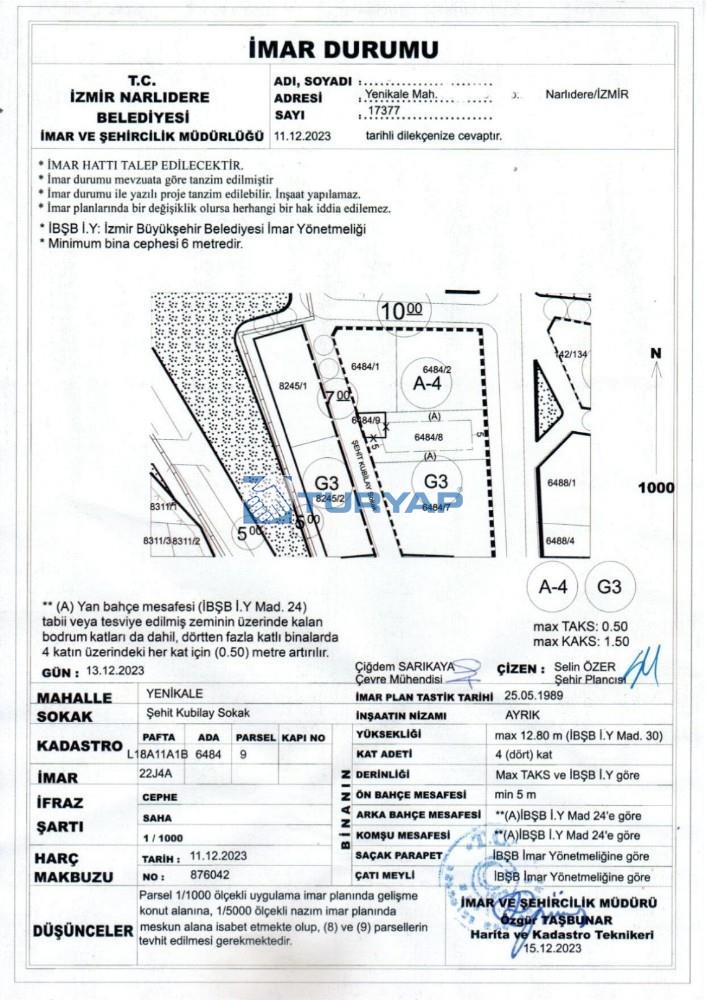 Narlıdere Belediyesi İmar işleri Müdürlüğü servis görevlisinden ekspertiz tarihinde alınan imar bilgisine