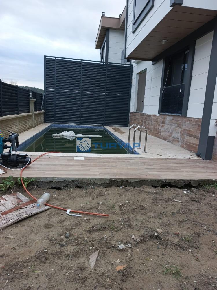 Villamız özel yapım olup 470 m2 alan içerisinde iki adet villadan oluşmaktadır.Girişleri ayrı olup müstakil havuz ve 200 m2 bahçe kullanım alanına sahiptir.