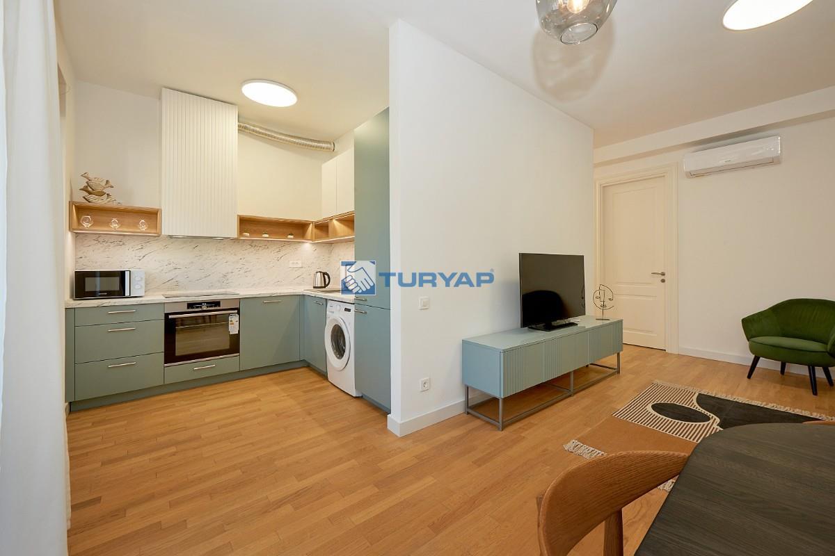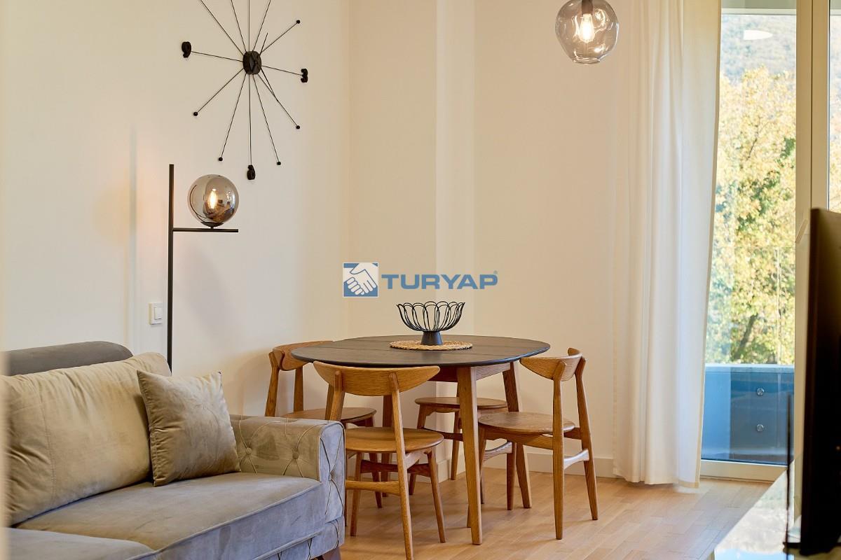 Budva'nın Bečići bölgesinde lüks bir komplekste, deniz manzaralı, 49 m² büyüklüğünde, tamamen eşyalıdır .
