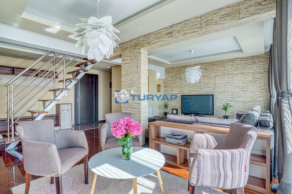 Modern bir konut binasının 7. ve en üst katında yer alan bu lüks dubleks çatı katı dairesi, 188 m²'lik bir alana yayılmış olup, sofistike tasarımı konfor ve işlevsellikle birleştiriyor. Daireye, asansörle erişilebilen bodrum katında özel bir garaj alanı da dahildir.