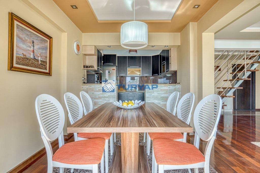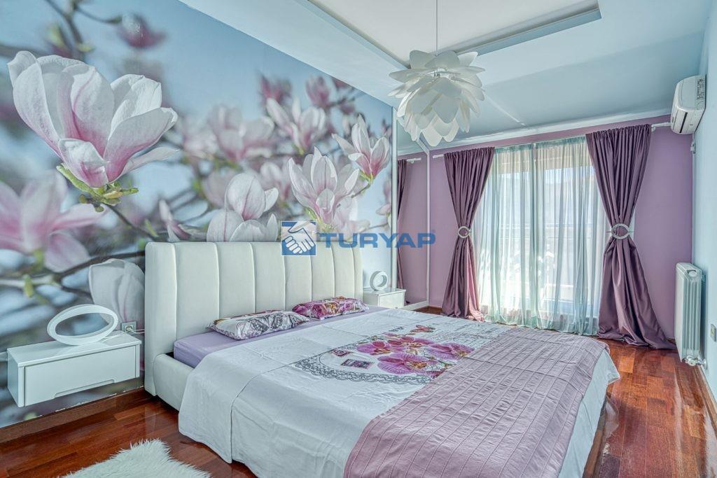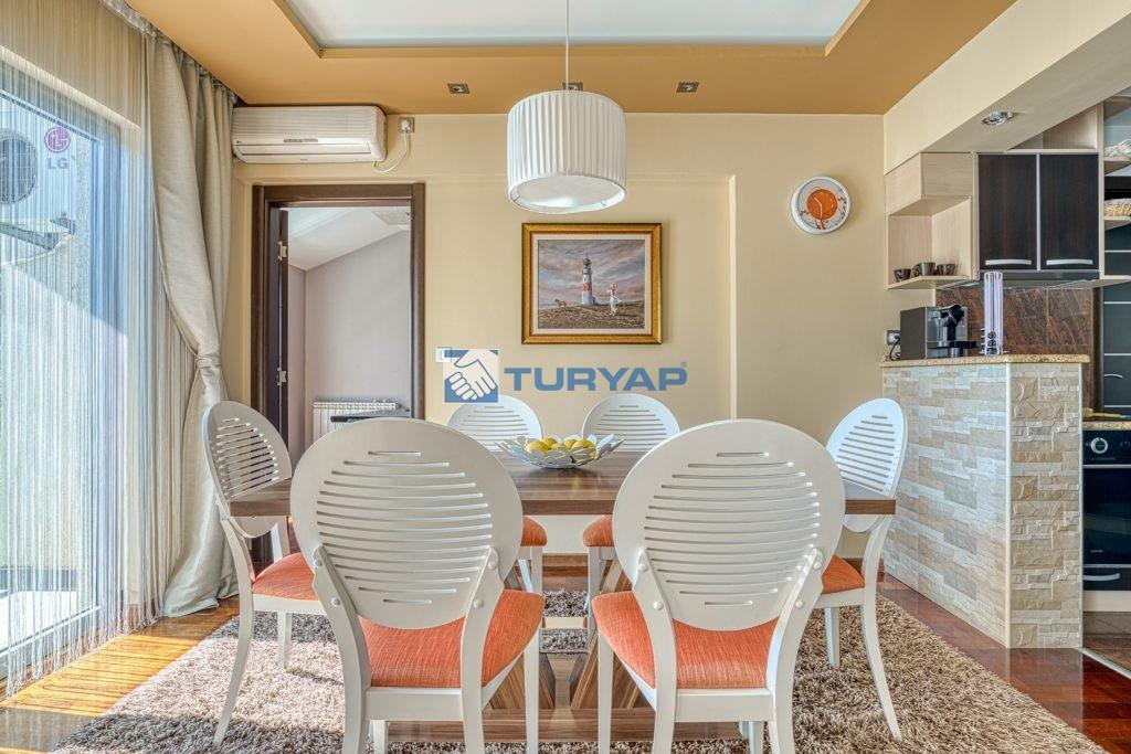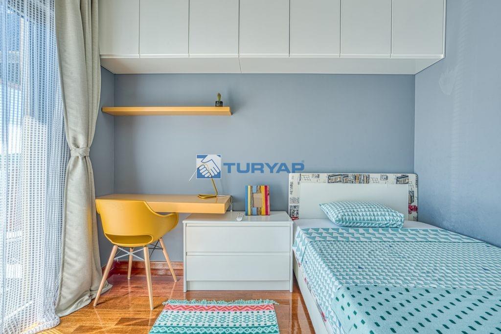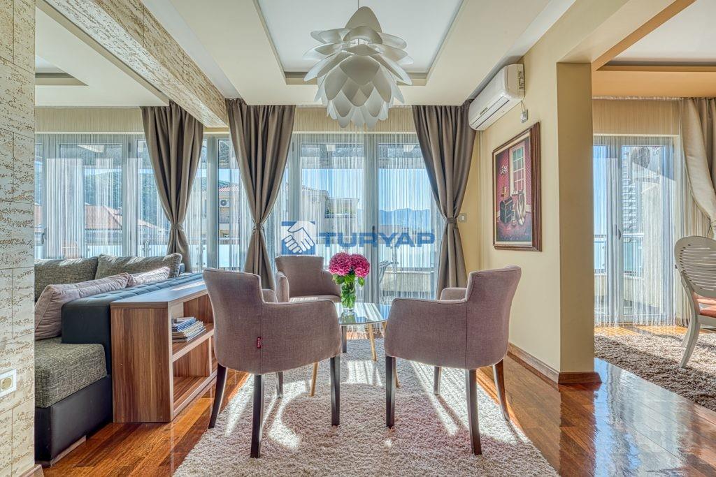 k sağlarken, oturma odası, yemek alanı ve yatak odasından erişilebilen geniş balkon, nefes kesen deniz manzarası sunmaktadır.