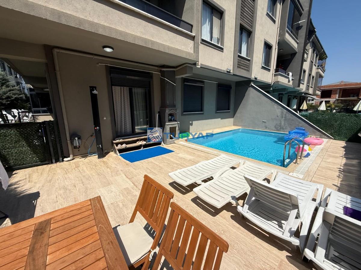 - Daireye özel etrafı çevrili 20 m² si havuz olmak üzere toplam 55 m² açık alan