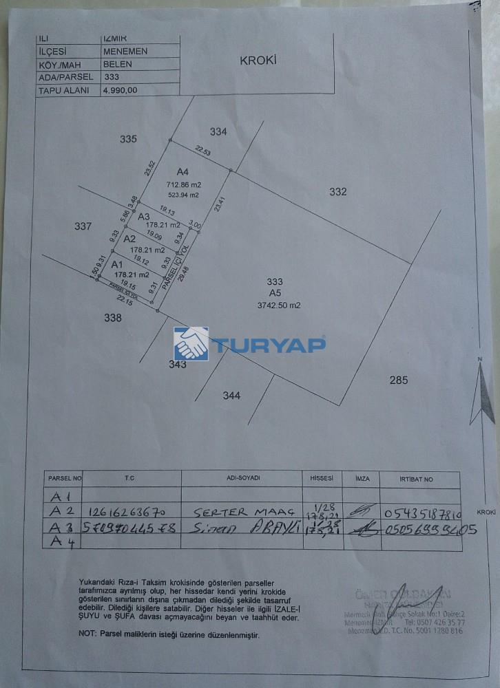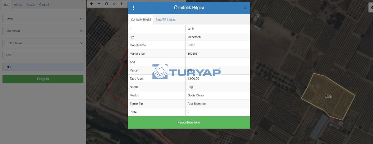 Menemen Belen mevkiin'de 178 metre kare, etrafı tel çit çevrili, yol ve elektrik gibi imkanlara sahip hobi bahçesi.