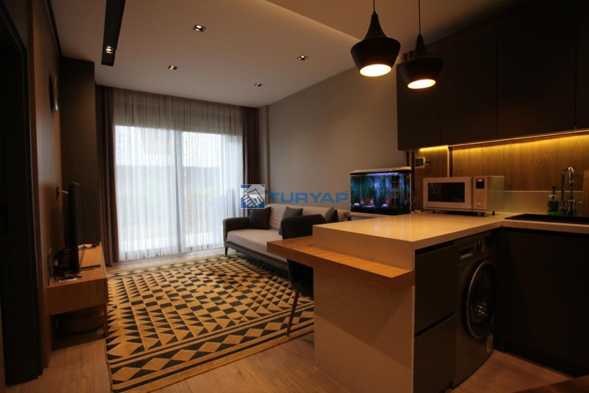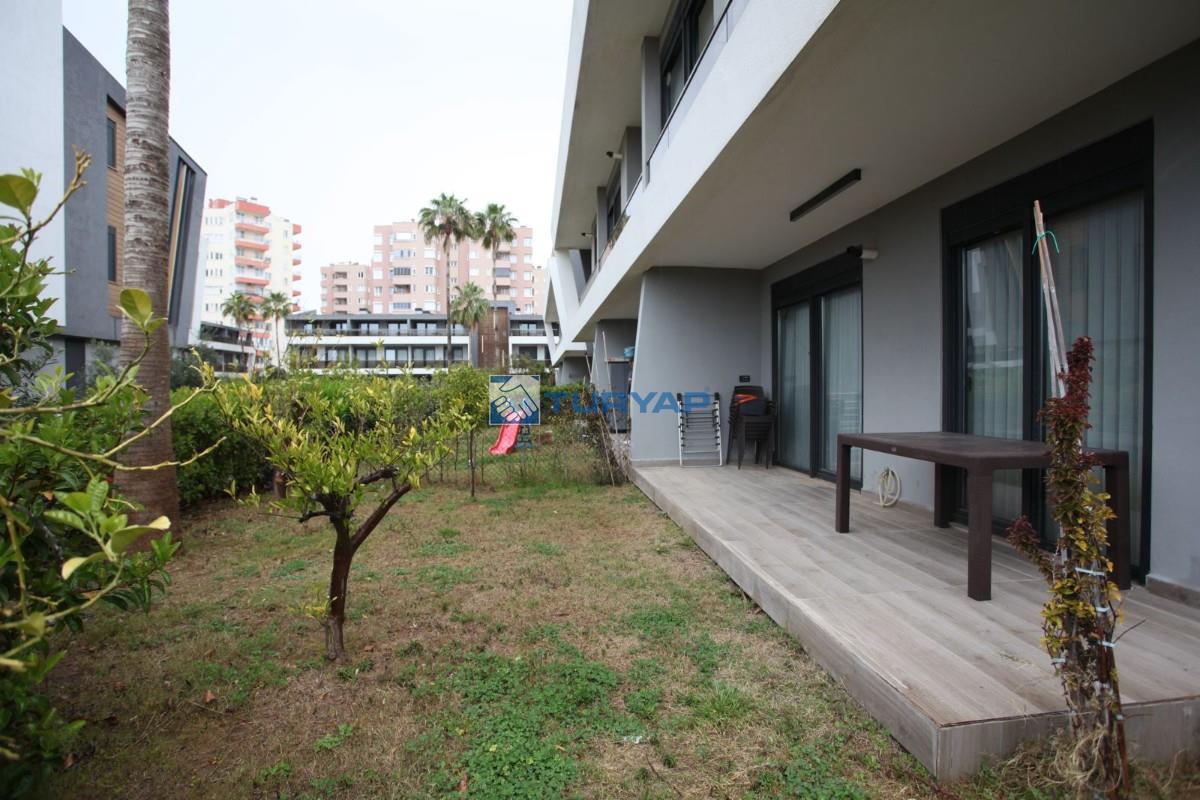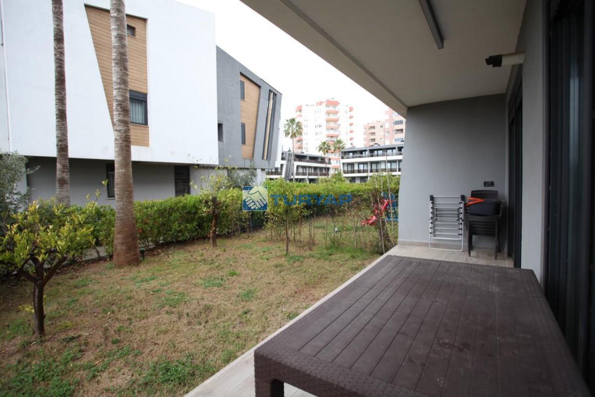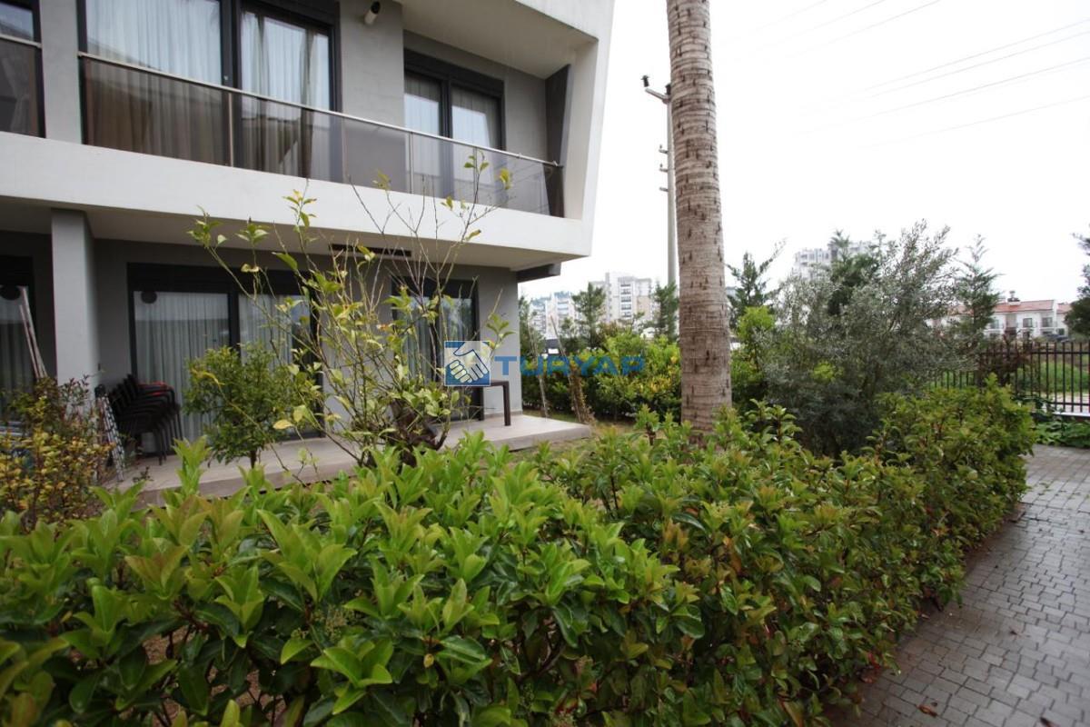 Antalya Lara Güzeloba Mahallesin de Tesisler Caddesi Üzerinde 1+1 Lüks Eşyalı Güvenlikli Full Özellikli Sitede 60 m2 Bahçe Kullanımlı 12 m2 Balkon Kullanımlı Satılık Bahçe Katı Köşe Daire