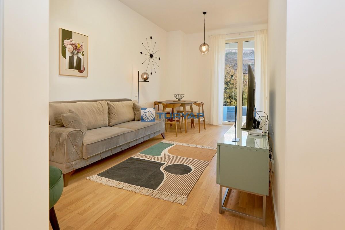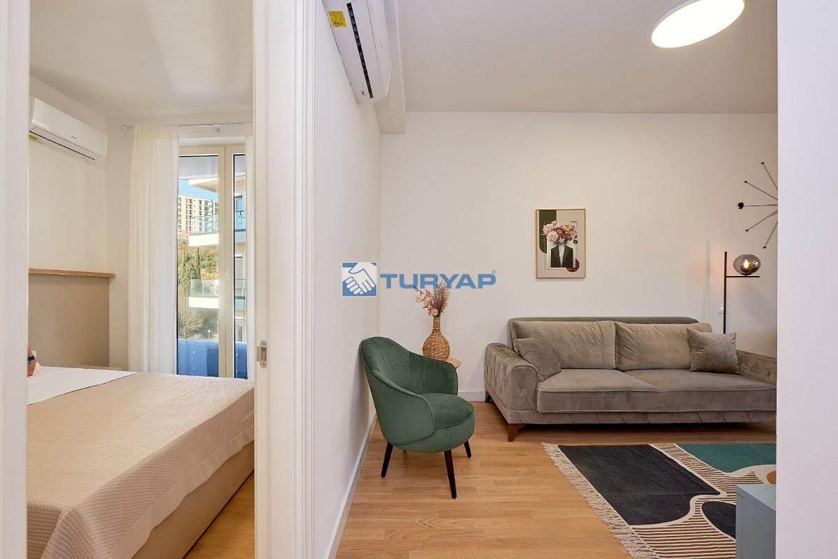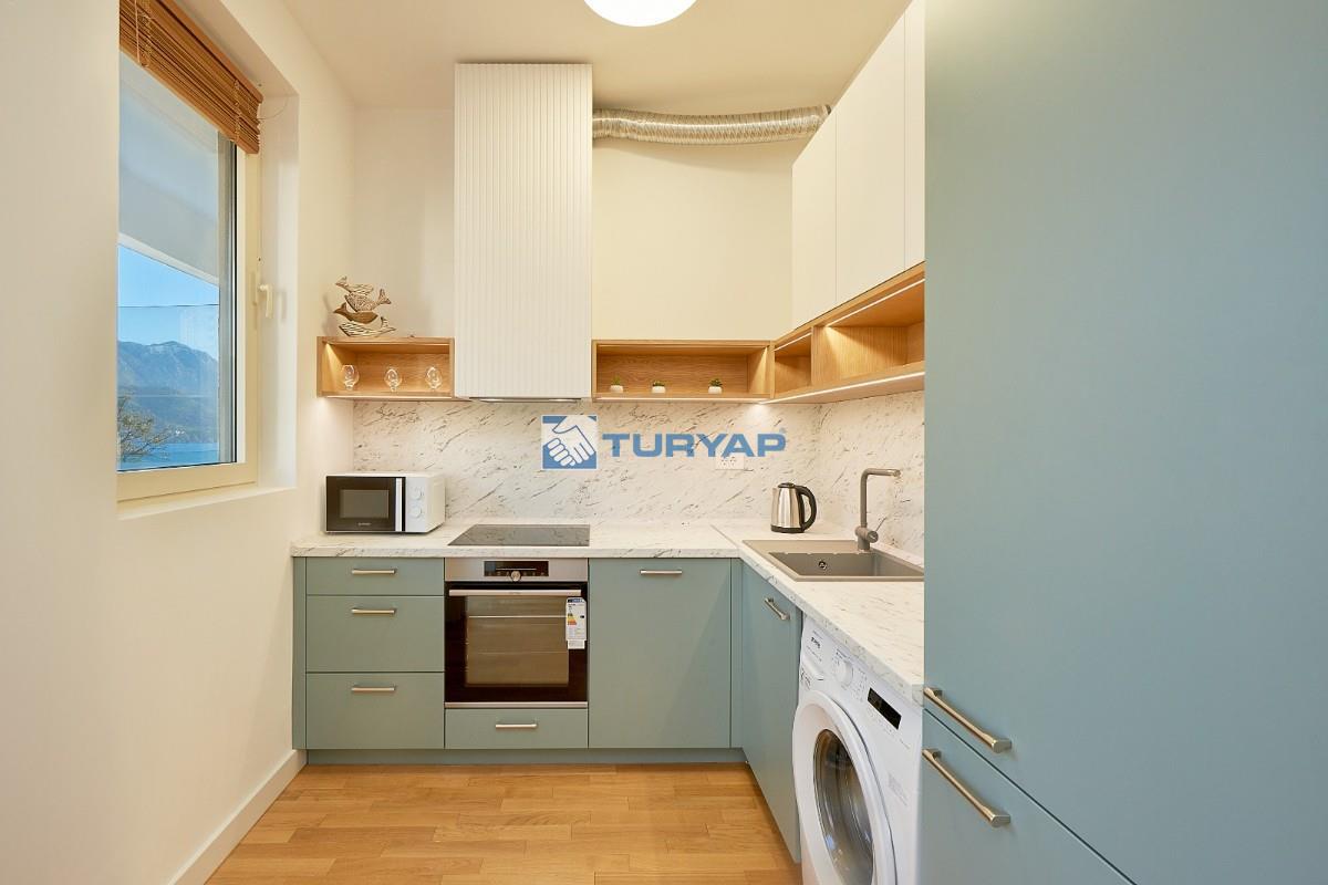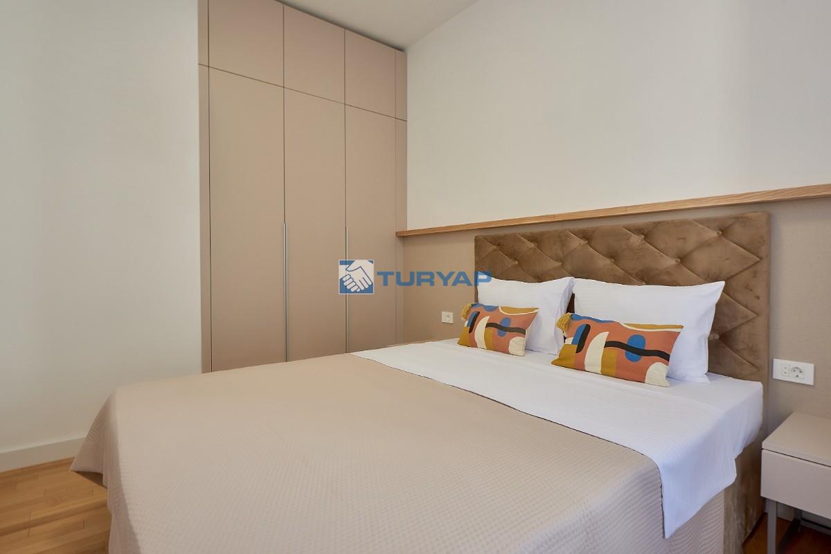 Budva'nın Bečići bölgesinde lüks bir komplekste, deniz manzaralı, 49 m² büyüklüğünde, tamamen eşyalıdır .