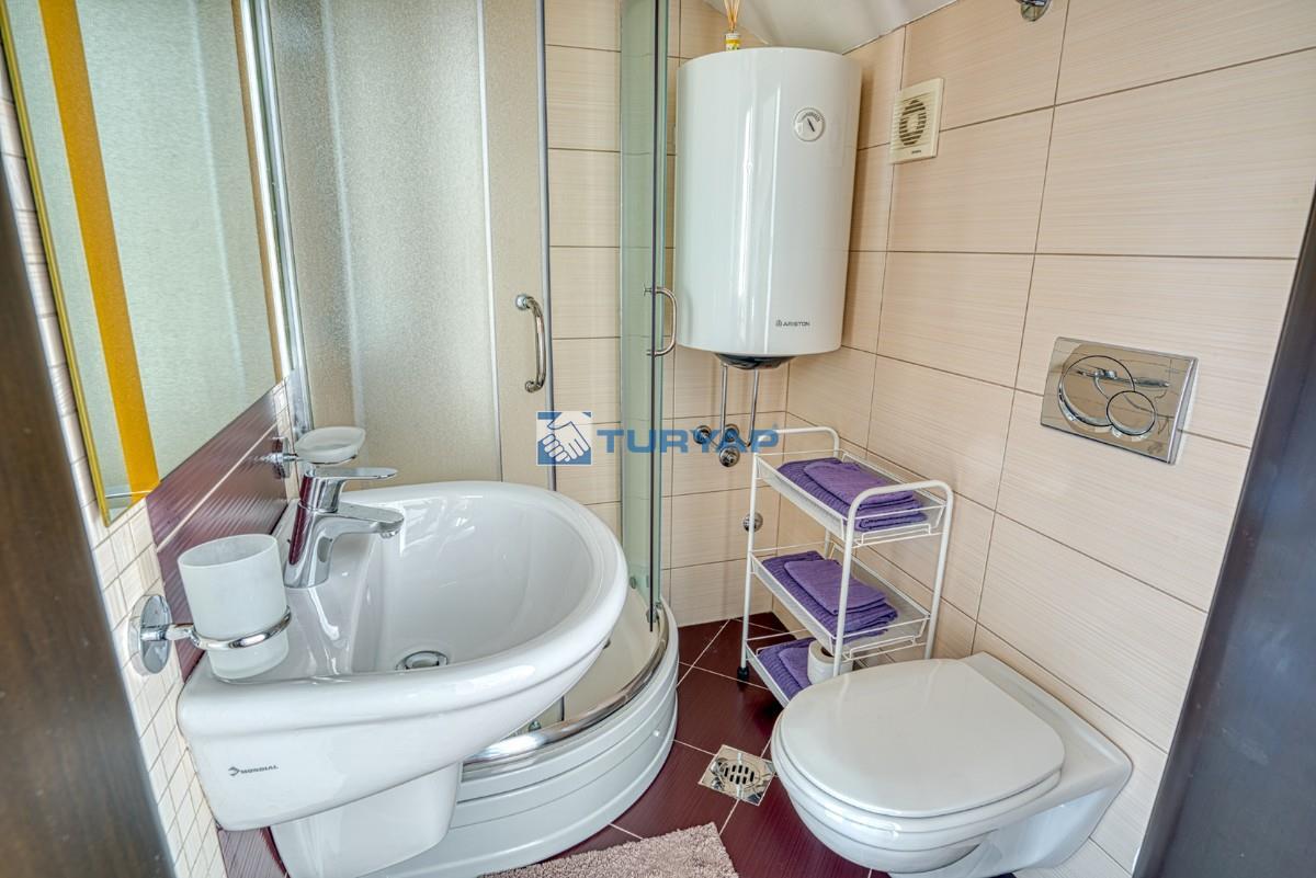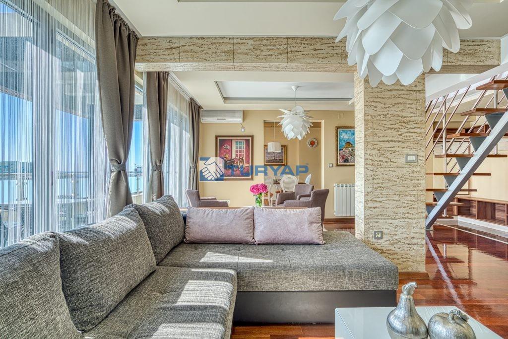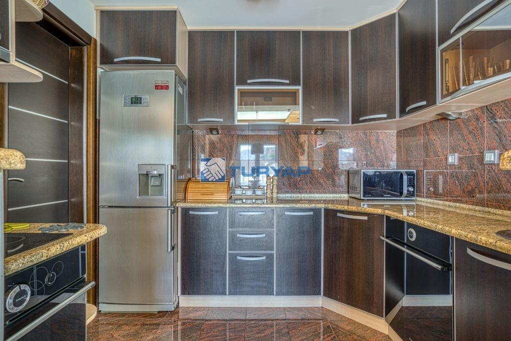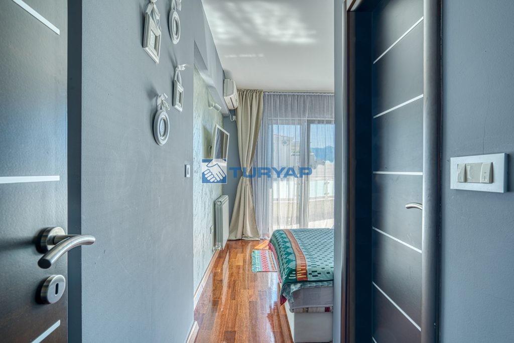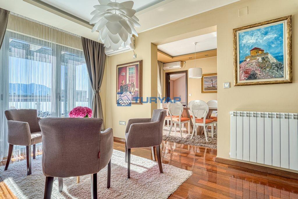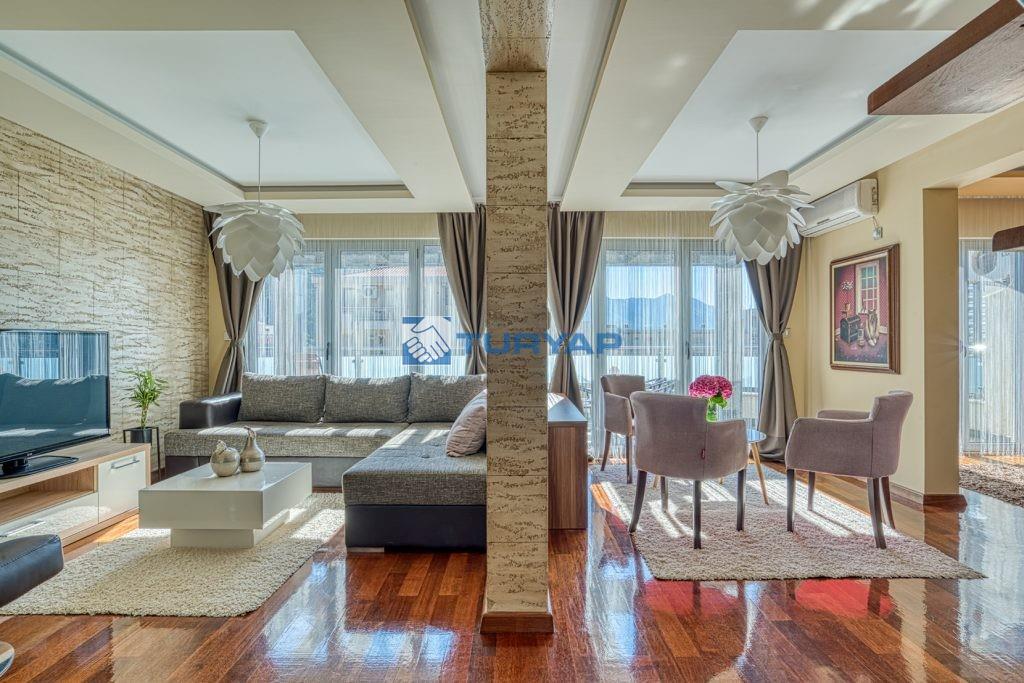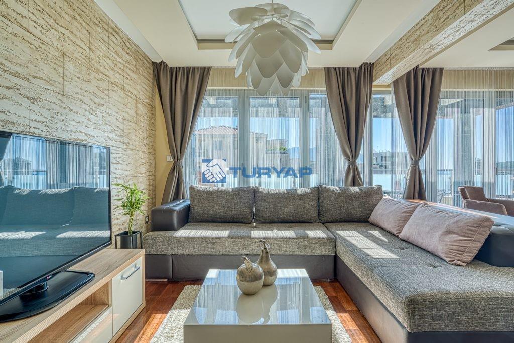 k sağlarken, oturma odası, yemek alanı ve yatak odasından erişilebilen geniş balkon, nefes kesen deniz manzarası sunmaktadır.