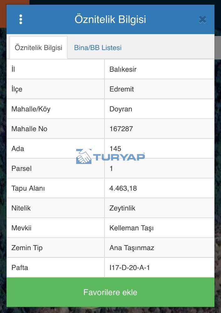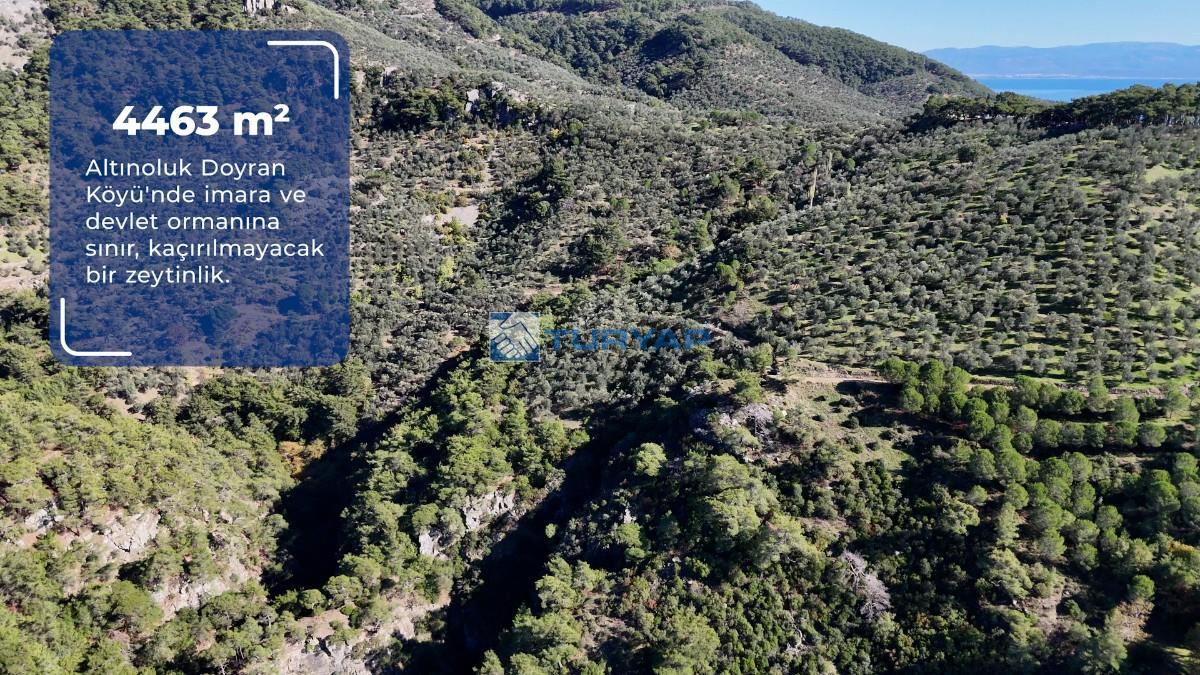 Balıkesir Edremit, Altınoluk Doyran Köyü’nde bulunan 4.463 m² büyüklüğündeki zeytinlik satışa sunulmuştur.
